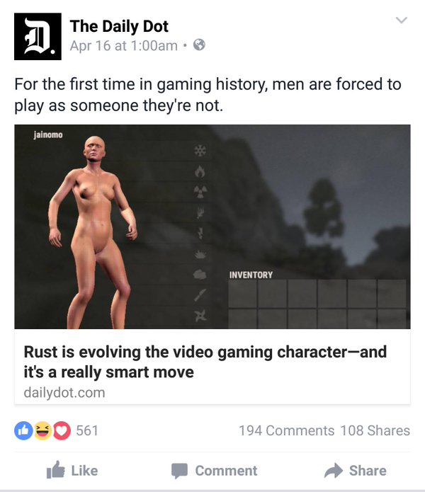 Not only is this demonstrably false, but how does this in any way further the discussion of inclusion and player choice? Let’s not forget that Rust isn’t just forcing men to play what they’re not, the game forces women and trans players to sometimes play what they’re not as well. If the developers had stupidly decided to not include female models at all we’d be reading headlines about how female players are once again forced to play male protagonists, and it would be a valid criticism. Some women still are in this game, but it seems more important that men are getting hit with it? This headline sounds more like being happy about getting revenge than furthering any sort of progress in gaming. It is also written by someone who clearly cares more about making a ‘political’ point rather than stating facts. After quite a few gamers pointed out all the female protagonists throughout gaming history the headline was changed.