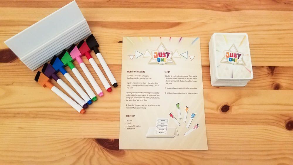 Just One is a party game where, in true parlor game fashion, you get a card with a word on it and your friends have to communicate it to you. With Just One, the card is placed on a pleasing white board stand and you pick a number from 1-5, which will communicate the word to your group. The other players then secretly write something related on their white board stands, then compare words. Any repeats are discarded and then these clues are shown to the first player. You then have to work out the word from their brilliant, but obscure clues.
