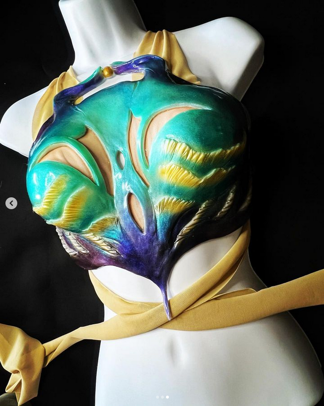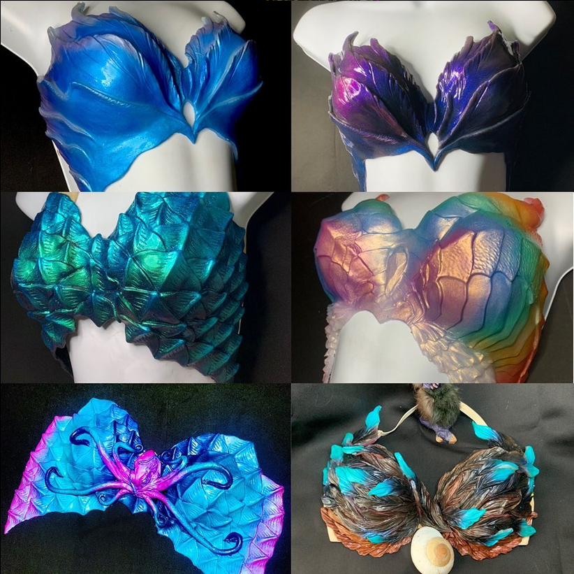 This Louisiana based top designer is quickly gaining popularity. Her tops are all silicone without a bra base, making them fully adjustable for the perfect fit (strapless bra bases are available in set sizes, too). But what really makes Madison’s work stand out are the unique and beautiful sculpts that can be customized with creative paint jobs to match your tail. My favorite sculpt is the stunning “Voyager” top with its gracefully flowing lines that resemble crashing waves and flowing fins. Bayou Mermaid tops are reasonably priced, fully custom, and much easier to get a hold of than tops from other top creators. I can personally attest to their high quality and the maker’s excellent customer service.