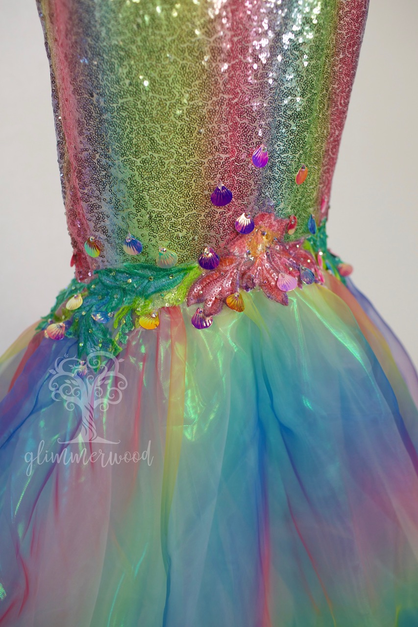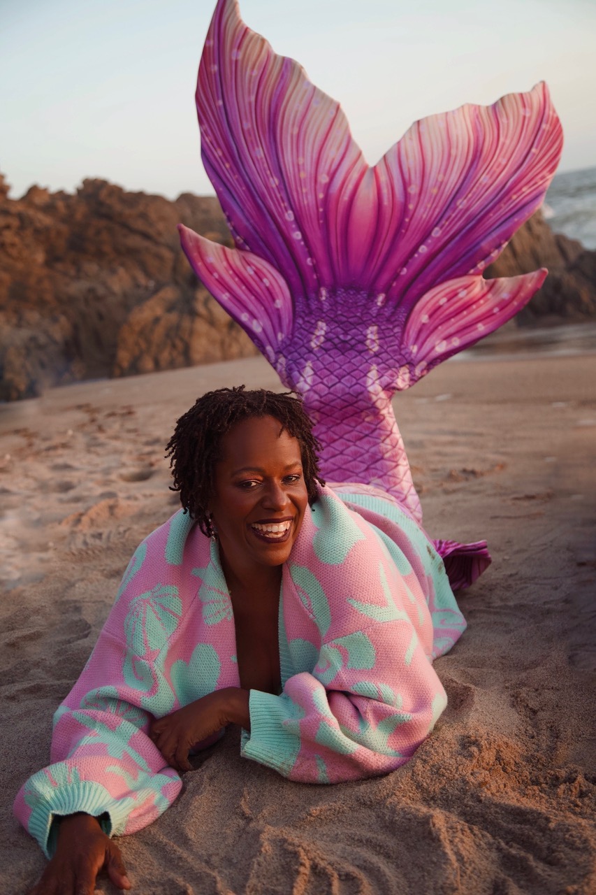 Glimmerwood is the only “dry” fashion label on this list, but I think she belongs here. An institution in the fantasy fashion community, designer Cassie Wanda is best known for her elaborate gowns, but also produces a growing line of ready-to-wear apparel. Her custom gowns express a variety of themes from cosplay to nature, to pure fantasy; many are inspired by mermaids and other marine life, and some even feature Finfolk’s iridescent resin scales. In addition to fully custom gowns slots, you can order a partially custom “Jellyfish Gown.” But the most important reason Glimmerwood is on the list is because of her super-comfy cardigans that I basically live in, which include three mermaid-inspired designs! It is important to stay warm and stylish on your way to, and especially from, swims.