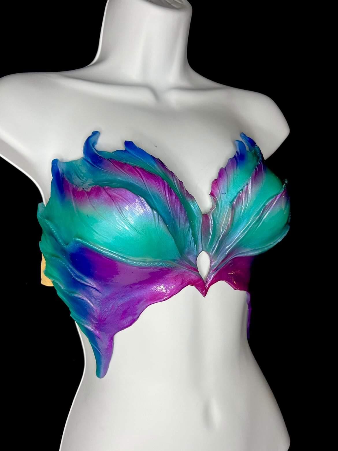 This Louisiana based top designer is quickly gaining popularity. Her tops are all silicone without a bra base, making them fully adjustable for the perfect fit (strapless bra bases are available in set sizes, too). But what really makes Madison’s work stand out are the unique and beautiful sculpts that can be customized with creative paint jobs to match your tail. My favorite sculpt is the stunning “Voyager” top with its gracefully flowing lines that resemble crashing waves and flowing fins. Bayou Mermaid tops are reasonably priced, fully custom, and much easier to get a hold of than tops from other top creators. I can personally attest to their high quality and the maker’s excellent customer service.