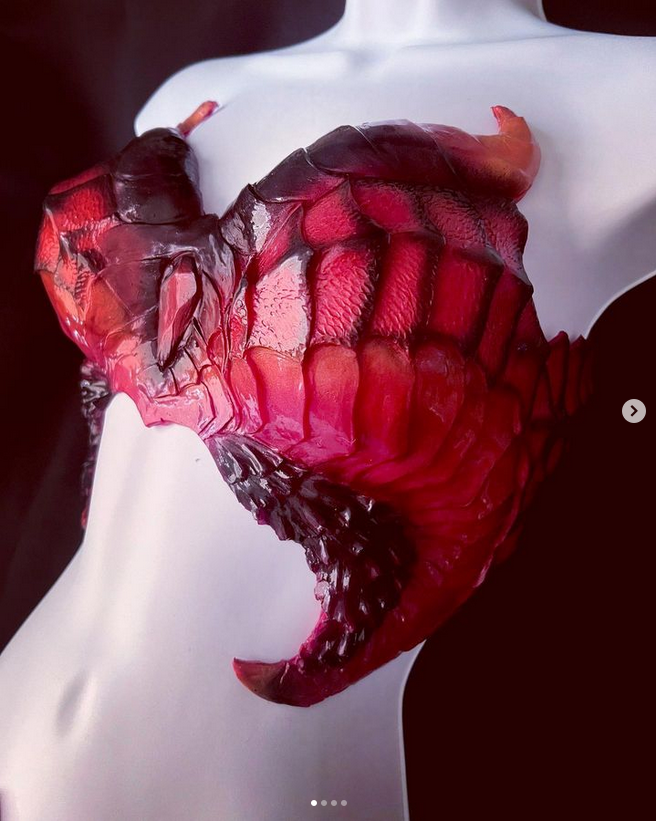 I only discovered this Mermaid Chrissi recently but wow is her work beautiful! This German artist makes beautiful silicone tails in shimmering, iridescent colorways, but her accessories are truly special. Iridescent silicone tops come in scale, shell, and abstract styles, including one that looks like dripping oil. She also offers neck pieces sculpted to look like gills as well as wide, sculpted silicone belts that can be worn like corsets. Furthermore, MerChrissi creates unique, chic dresses strewn with silicone scales.
