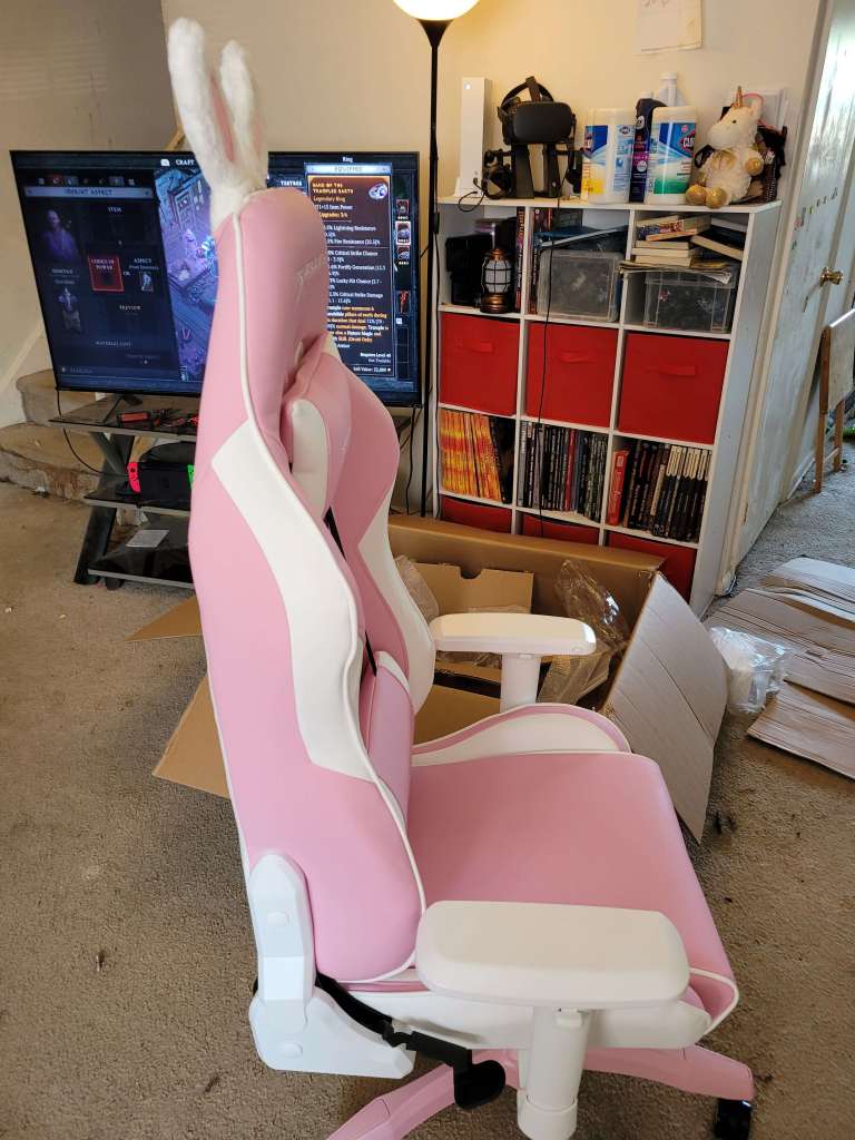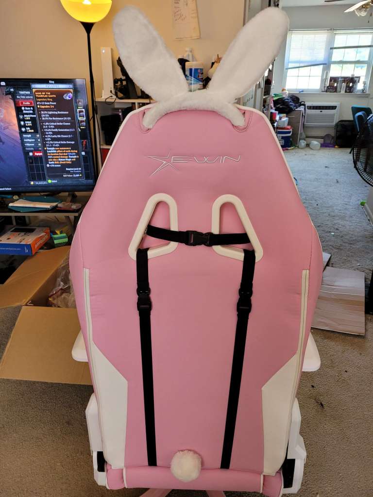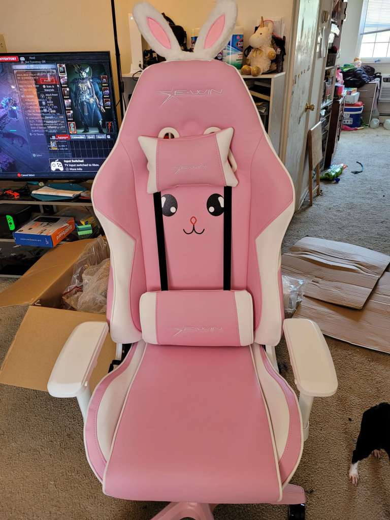 A couple months back E-WIN was nice enough to send me an E-WIN Champion Series Ergonomic Computer Gaming Office Chair With Pillows, Pink Bunny for review. I have to admit that I was excited. A huge problem for gamers is an adequate chair that will be comfortable, and this is made much harder when you are plus-sized. It’s hard to find a chair that will not be a constant reminder that the world isn’t built for people our size. When it comes to streaming, of course, we want a flashy-looking chair that people can see but it also has to stick with us for long hours, extra work, late nights, and so on.