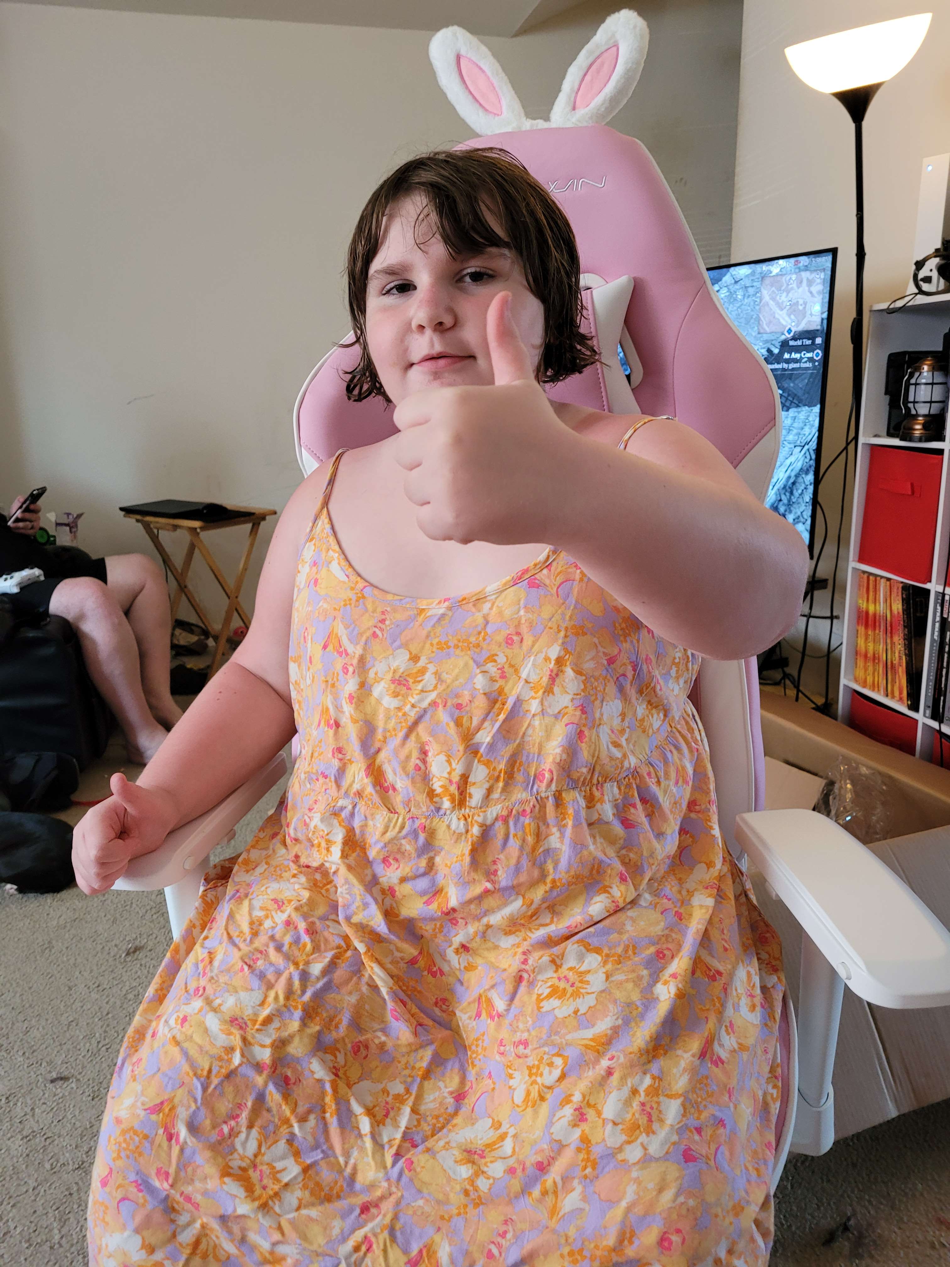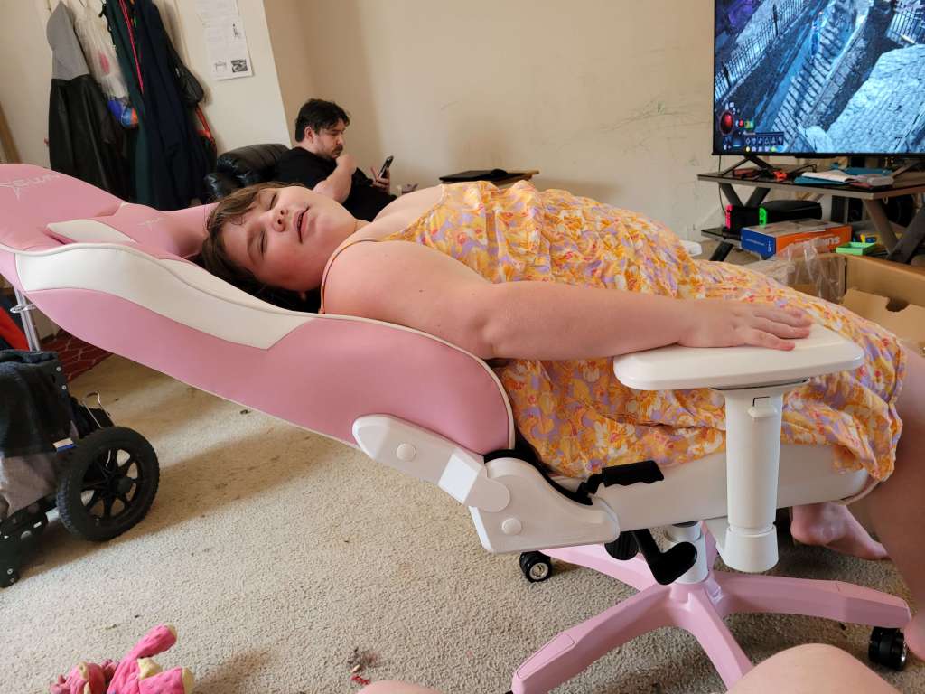 It doesn’t feel very plus-sized friendly, unfortunately. The seat of the chair was wide enough for me to sit comfortably but not for my husband. However, my 8-year-old daughter LOVES the chair. She doesn’t care that her feet are dangling. She says it’s very comfortable and she likes the pillows. The bunny ears and tail in addition to the pale pink color is just adorable in her eyes. I like that it moves on carpet so easily so she doesn’t struggle moving it. Telling you, those wheels are awesome.