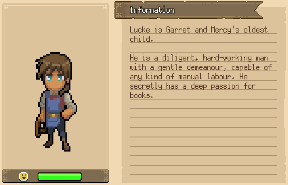 Lucke is the elder child of the couple who own the village farm, where the player can purchase cooking ingredients, and he should be allowed to get married. To me, the player character. He is very smart, loves books, and dabbles in engineering. He is torn between wanting to go to university in the city and staying in Moonbury to help out with the farm. Your first friendship event with him involves meeting on a scenic cliff at sunset to discuss books. If that is not a perfect first date, I don’t know what is. His mother is very concerned about his marriage prospects and frequently mentions this to the player.