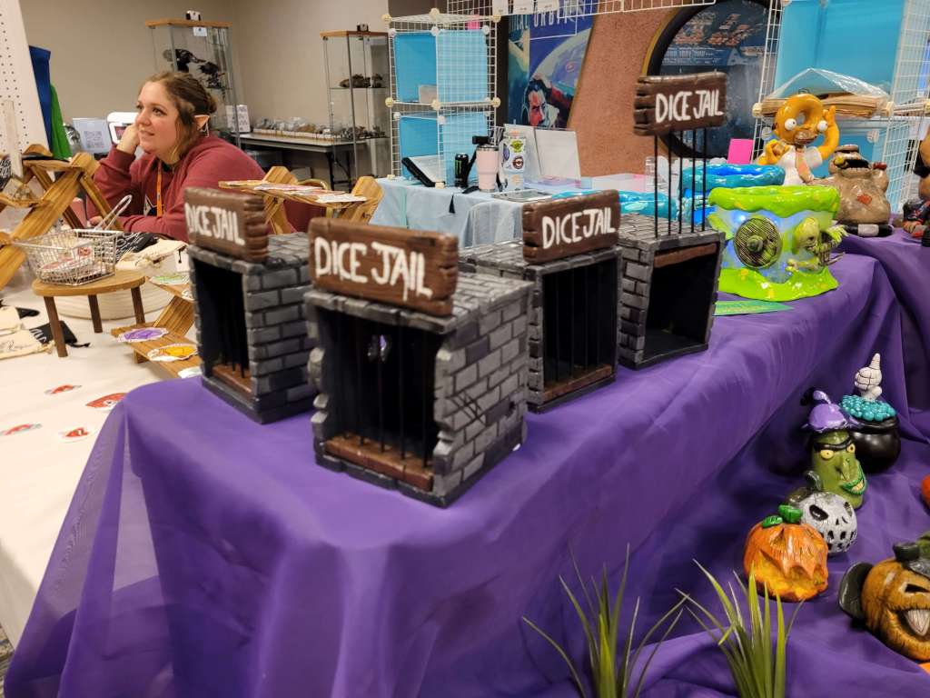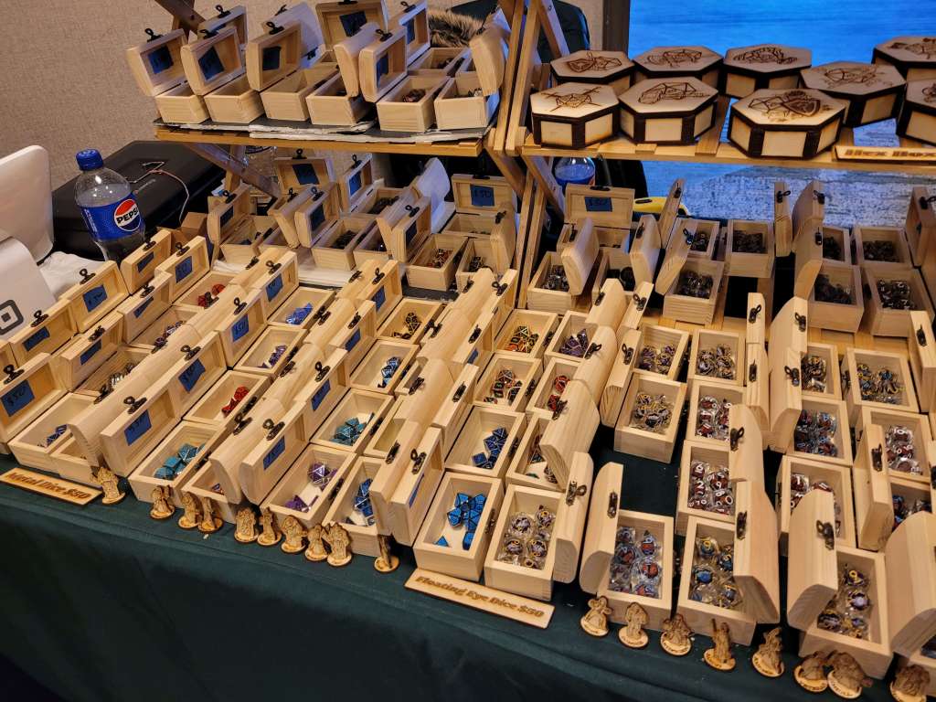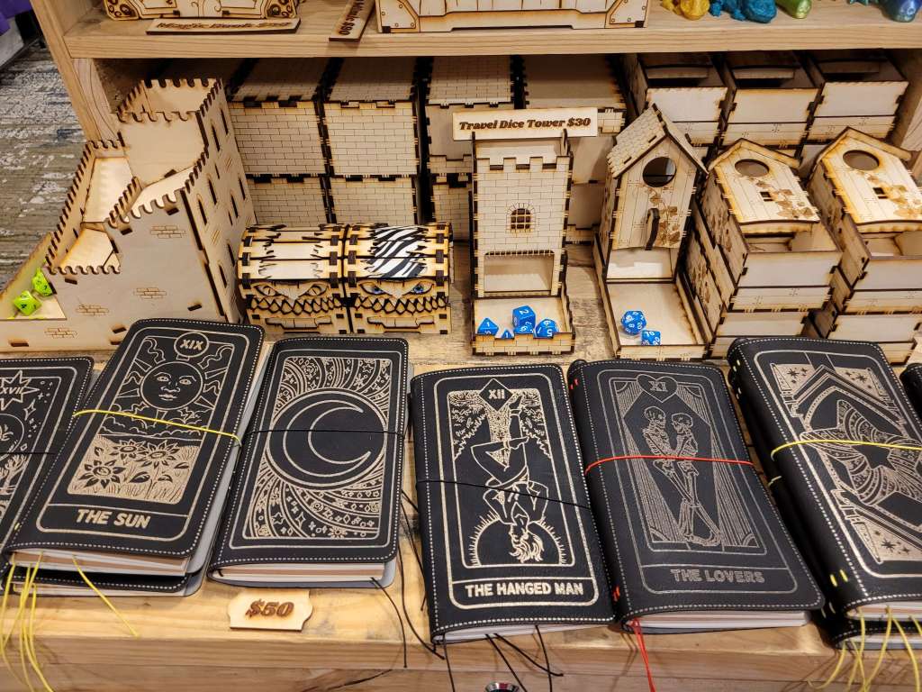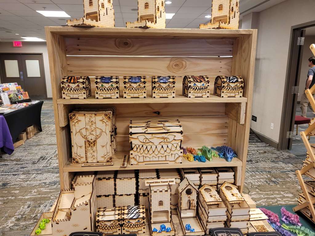 We walked away with an adorable 3D Dragon for my Lily from 3D2U (who’s business card is also a ruler, made of wood. Honestly, I’m gonna use this) and had I all the money to throw at them, I would have. Dice towers, dragons, mimic boxes and monster books. I would have bought it all with nowhere to put all the stunning work. The Beaded Halfling has the best wooden tiles and accessories for your table. There are a few different things I love about his work. Laser cut wood tiles seems an easy concept. But the thought put behind his work is admirable. So, follow me here, the flat parts obviously fit next to each other but the sides that are decoratively cut can also be put together to form a canyon. He has a water section that you can put a clear blue plastic bit in to show that it’s water and still see the squares. Not water, that’s fine. He’s got green, red, black… you can have your players stepping in ANYTHING. Ew. Not to mention the blocks, working portcullis, stairs, pillars. I’m honestly so impressed and the prices are reasonable. If we were still played TTRPGs in person (and if we do in the future), this would be on my list.