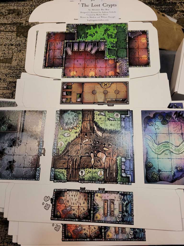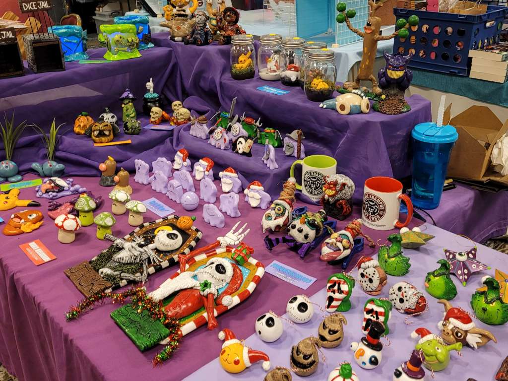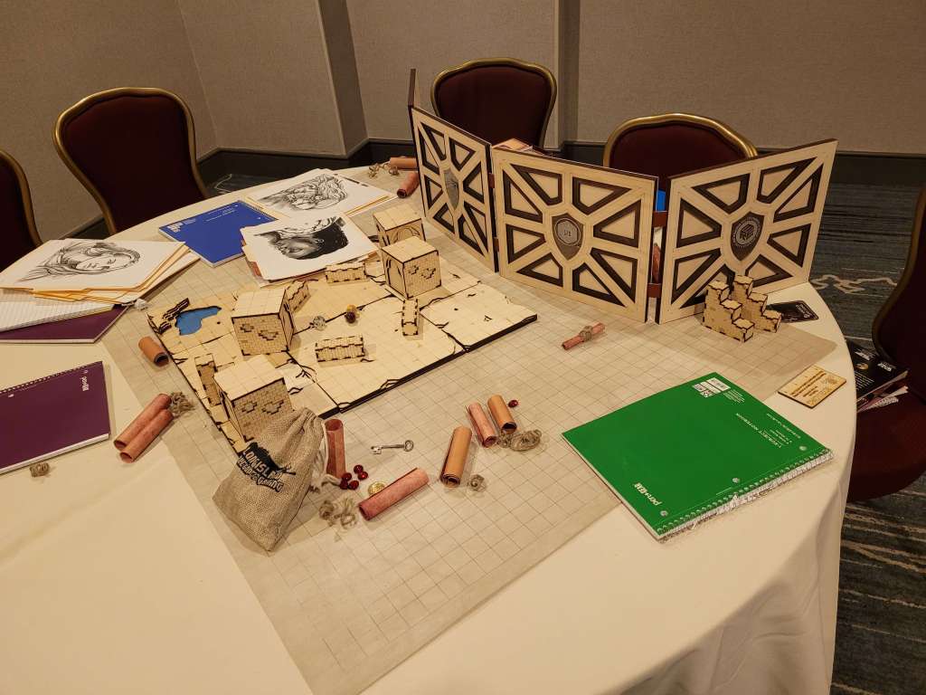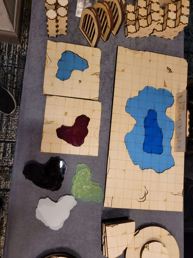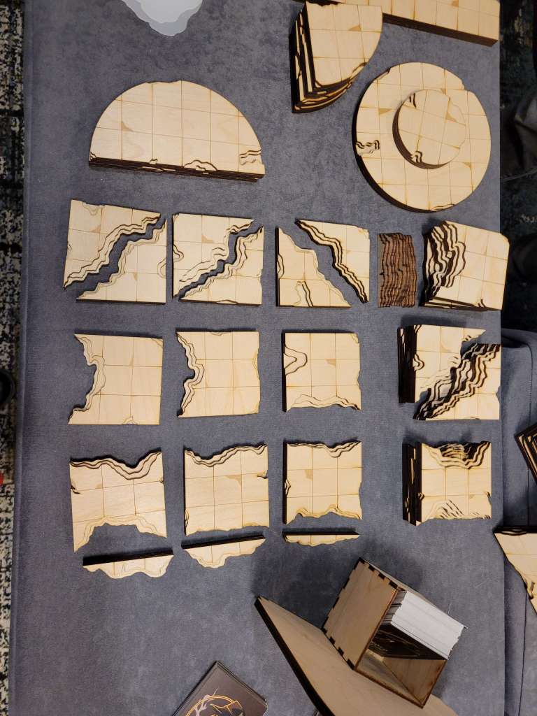 We walked away with an adorable 3D Dragon for my Lily from 3D2U (who’s business card is also a ruler, made of wood. Honestly, I’m gonna use this) and had I all the money to throw at them, I would have. Dice towers, dragons, mimic boxes and monster books. I would have bought it all with nowhere to put all the stunning work. The Beaded Halfling has the best wooden tiles and accessories for your table. There are a few different things I love about his work. Laser cut wood tiles seems an easy concept. But the thought put behind his work is admirable. So, follow me here, the flat parts obviously fit next to each other but the sides that are decoratively cut can also be put together to form a canyon. He has a water section that you can put a clear blue plastic bit in to show that it’s water and still see the squares. Not water, that’s fine. He’s got green, red, black… you can have your players stepping in ANYTHING. Ew. Not to mention the blocks, working portcullis, stairs, pillars. I’m honestly so impressed and the prices are reasonable. If we were still played TTRPGs in person (and if we do in the future), this would be on my list.