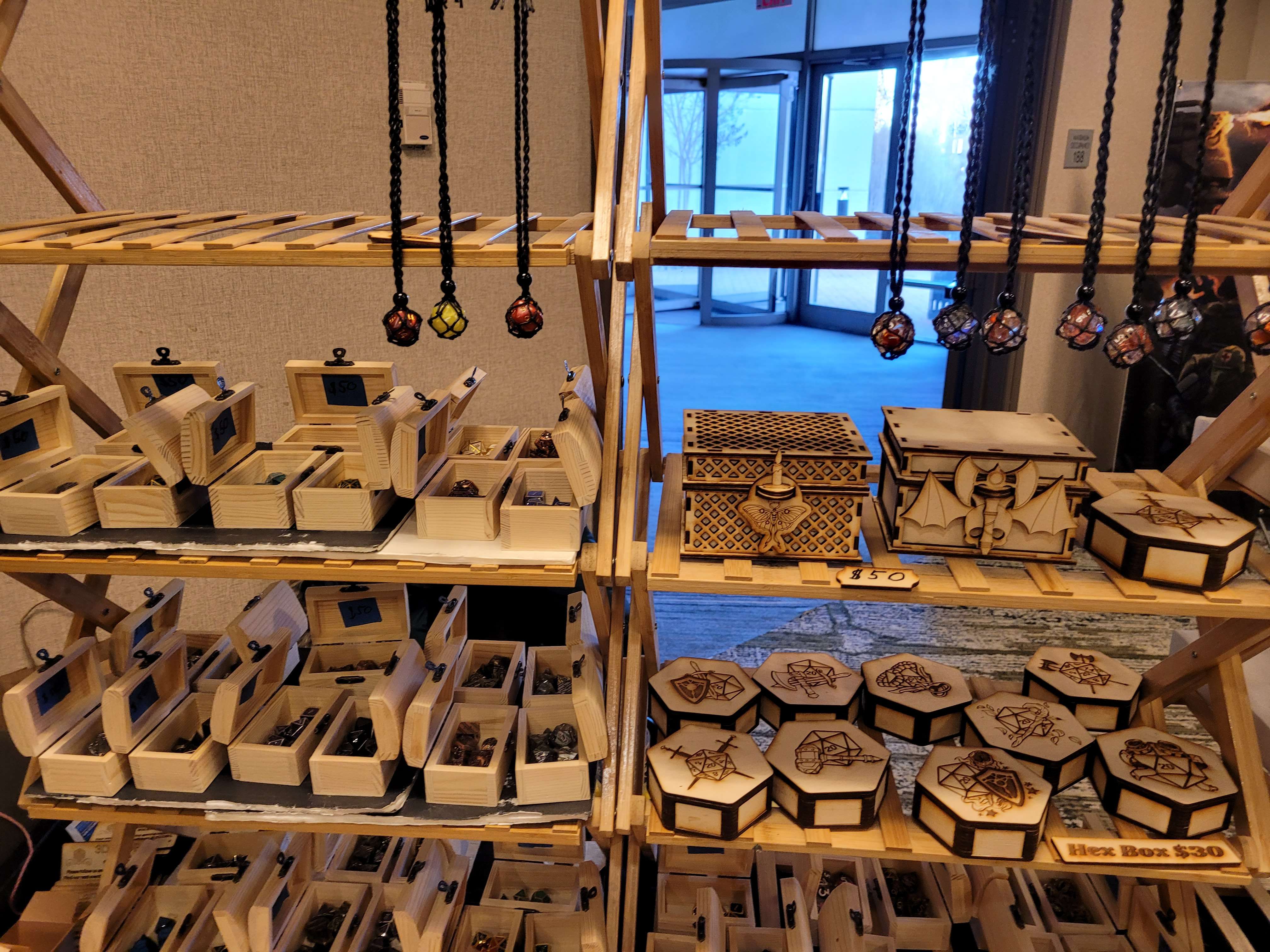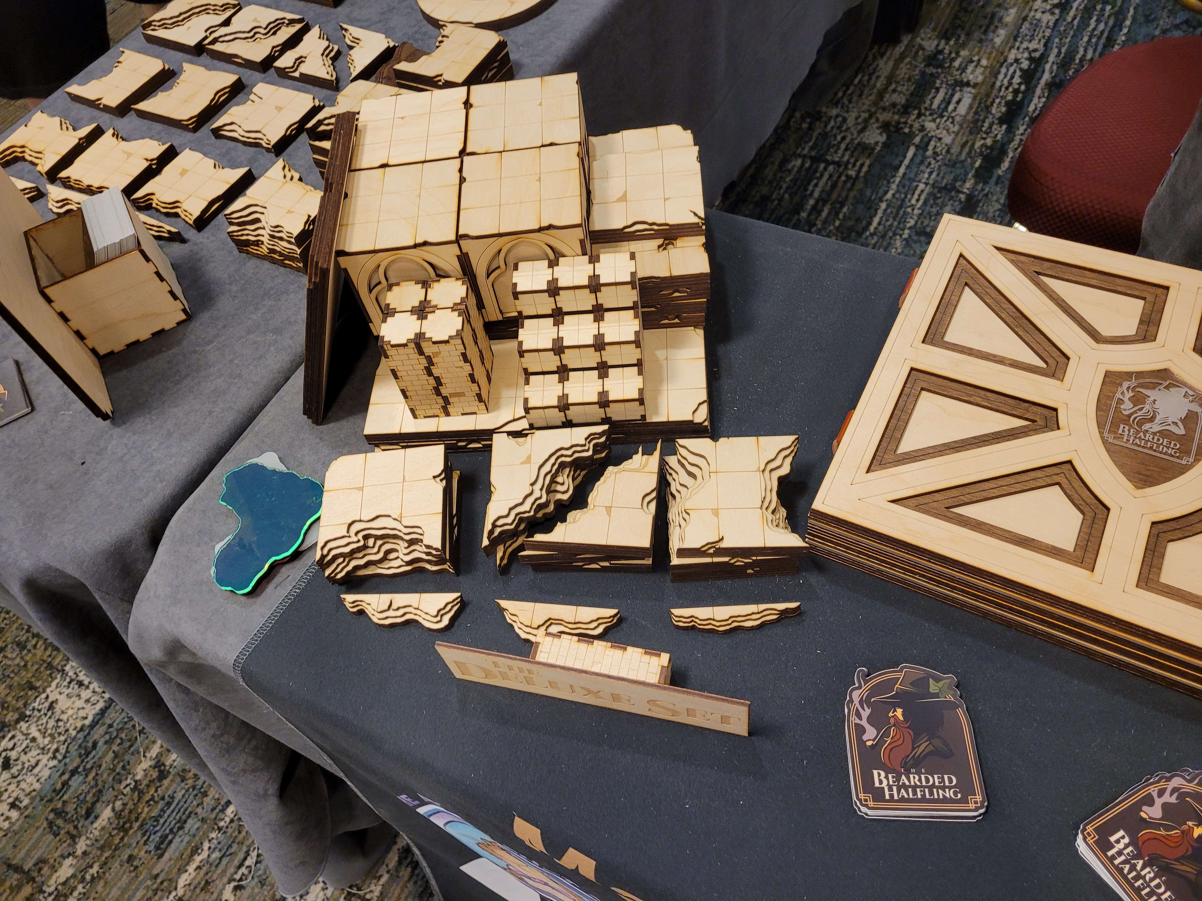 We walked away with an adorable 3D Dragon for my Lily from 3D2U (who’s business card is also a ruler, made of wood. Honestly, I’m gonna use this) and had I all the money to throw at them, I would have. Dice towers, dragons, mimic boxes and monster books. I would have bought it all with nowhere to put all the stunning work. The Beaded Halfling has the best wooden tiles and accessories for your table. There are a few different things I love about his work. Laser cut wood tiles seems an easy concept. But the thought put behind his work is admirable. So, follow me here, the flat parts obviously fit next to each other but the sides that are decoratively cut can also be put together to form a canyon. He has a water section that you can put a clear blue plastic bit in to show that it’s water and still see the squares. Not water, that’s fine. He’s got green, red, black… you can have your players stepping in ANYTHING. Ew. Not to mention the blocks, working portcullis, stairs, pillars. I’m honestly so impressed and the prices are reasonable. If we were still played TTRPGs in person (and if we do in the future), this would be on my list.