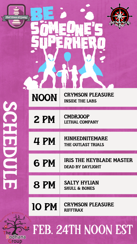 We are raising money via Tiltify, on February 24th from Noon to Midnight EST on Twitch. We will be doing a stream relay for those 12 hours. Streaming a game for two hours before handing it off to the next streamer.